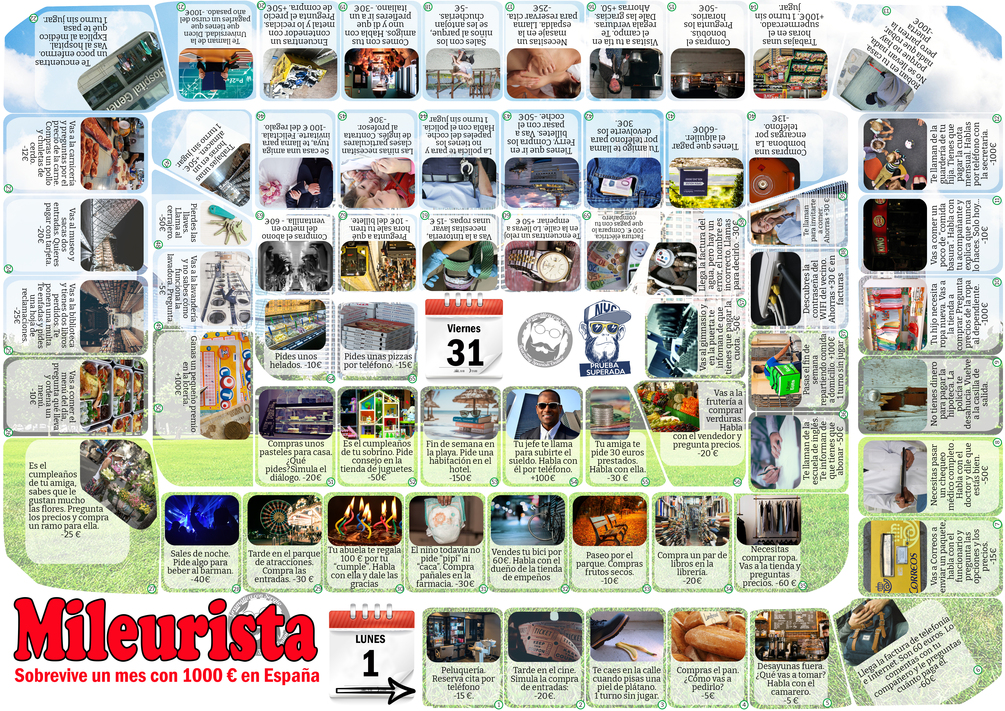 馃憠El juego est谩 ideado para A1. Los participantes reciben una hoja de gasto, con un saldo de 1000 euros, y tienen que superar la "oca del mileurista" y llegar al final con algo de dinero en el bolsillo. El jugador debe desarrollar los di谩logos de las casillas en las que va cayendo y hacer una producci贸n correcta. Se puede jugar en parejas y as铆 la pareja debe producir el di谩logo, y el profesor solo controlar la producci贸n.